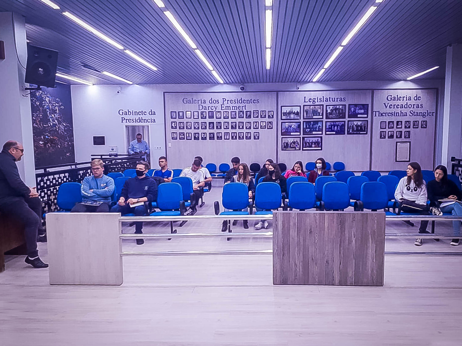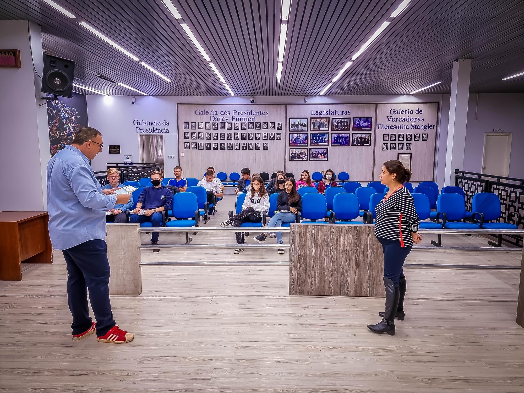 Em um primeiro momento, no plenário, os jovens tiveram uma palestra com Conzatti e Sucolotti, que discorreram sobre os Três Poderes, especialmente sobre o Poder Legislativo Municipal, o papel do parlamentar e também sobre democracia e cidadania. Os alunos, também tiveram a oportunidade de conhecer como funciona o processo de votação eletrônica das sessões, a TV do Legislativo e a sala administrativa.